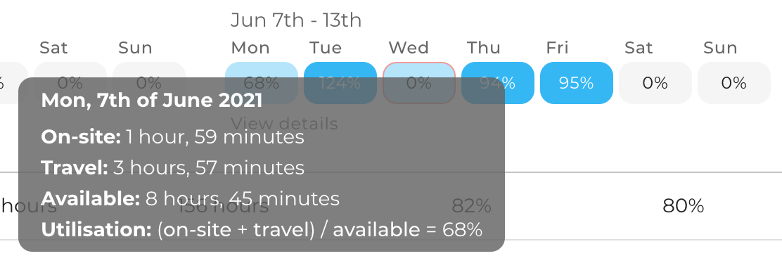 You can hover over any of the days in the engineer breakdown to see the details of how the utilisation figure was calculated for that day.