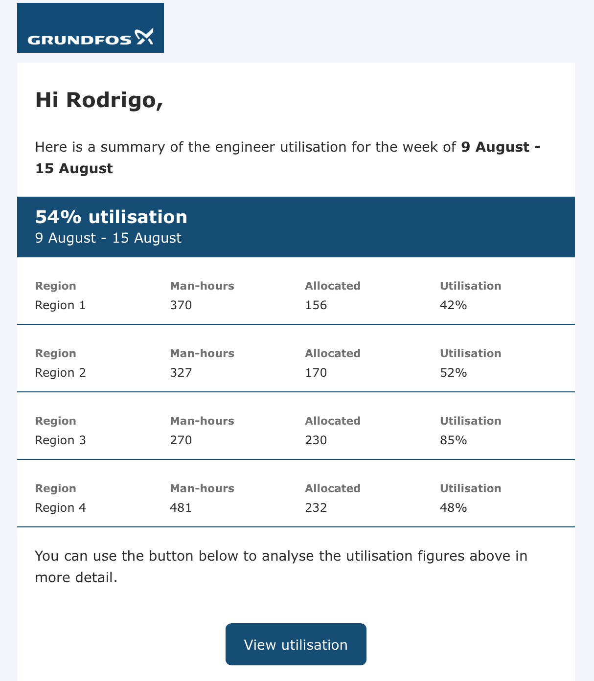 The utilisation summary aggregates the overall metrics for the time period selected. Engineers not allocated to the main Grundfos regions (e.g. water utilities and sub-contractors) are excluded from the overall utilisation calculations.